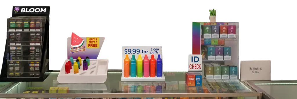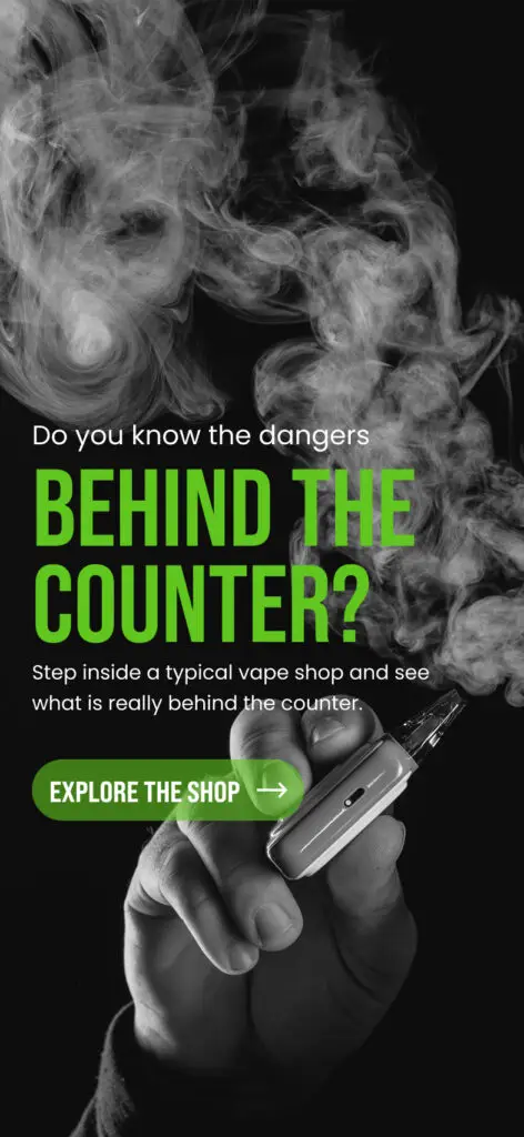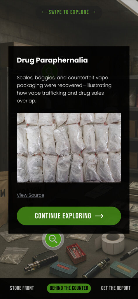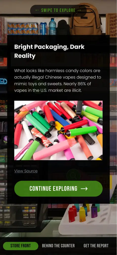 A brightly lit vape shop interior. Candy-colored packaging. Youth-targeted signage. A storefront that feels typical. Six tappable hotspots reveal concise, sourced insights, from unauthorized brands to misleading “FDA Approved” signage to flavors banned domestically in China but exported to the U.S.