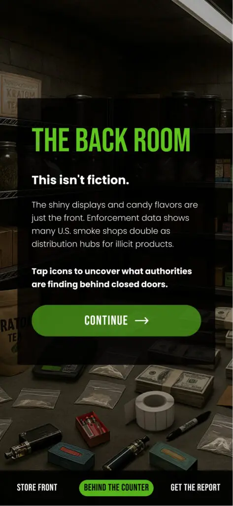 Lighting drops. Colors desaturate. Shelves clutter. Hidden compartments emerge. The narrative references real enforcement actions, including DEA-led initiatives such as Operation Vape Trail.