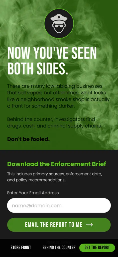 Haneke Design partnered with a national public safety organization to create a mobile-first immersive web experience for law enforcement education. Designed for convention attendees and kiosk deployment, the React-based application contrasted the bright façade of illicit vape shops with the criminal activity often uncovered behind the counter.